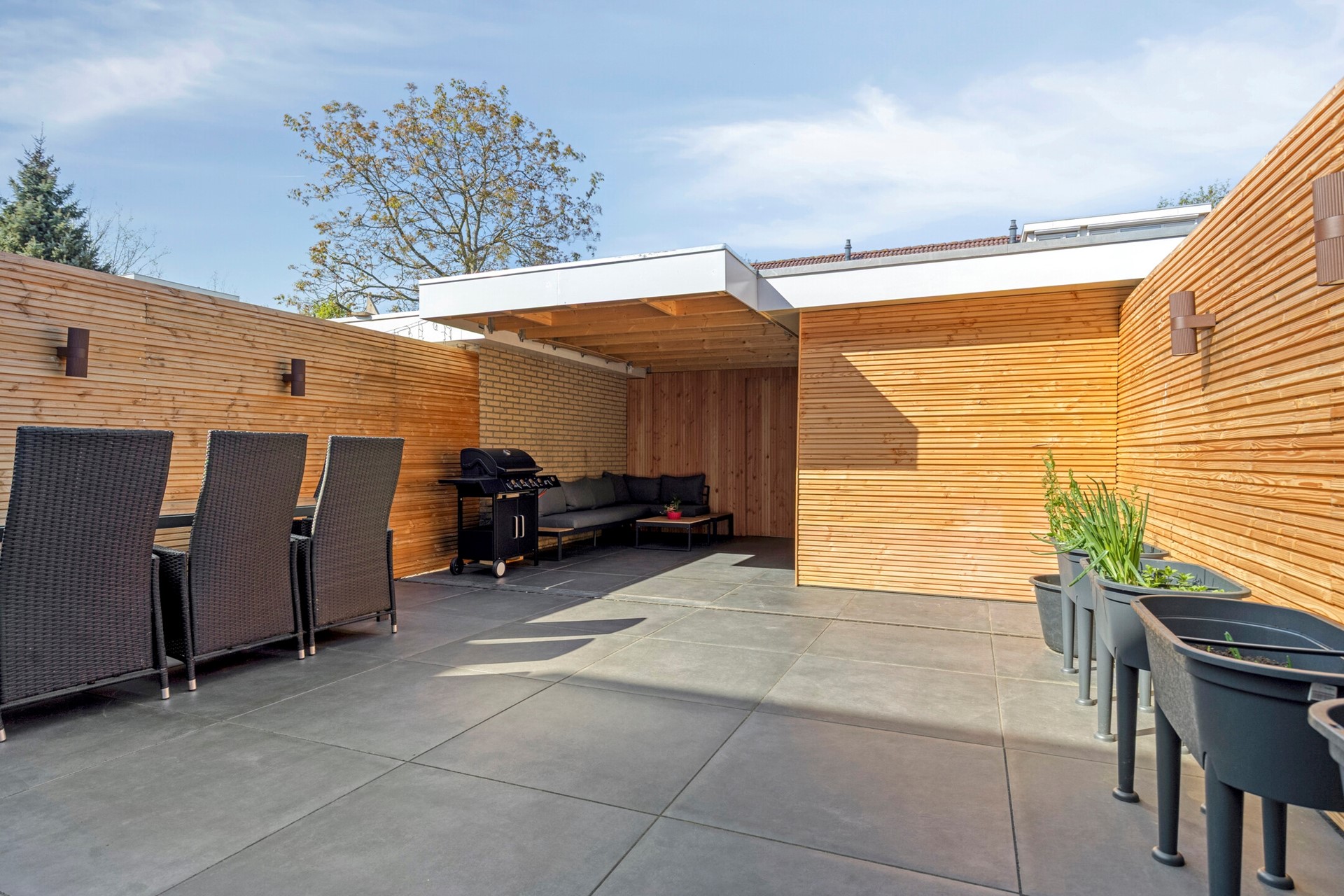 De achtertuin is in 2025 volledig vernieuwd en voorzien van nieuwe schuttingen inclusief verlichting, strakke onderhoudsarme bestrating en aan de berging is een overkapping gerealiseerd waarin je heerlijk kunt zitten. De tuin heeft een achterom.