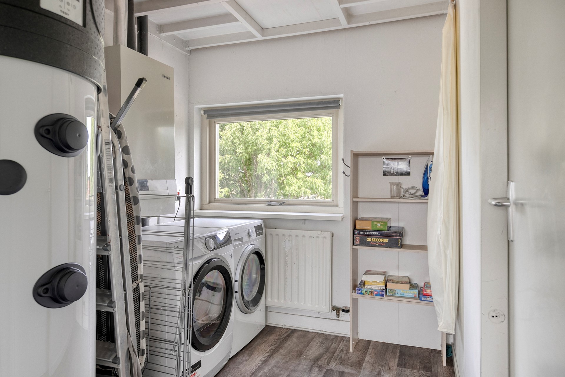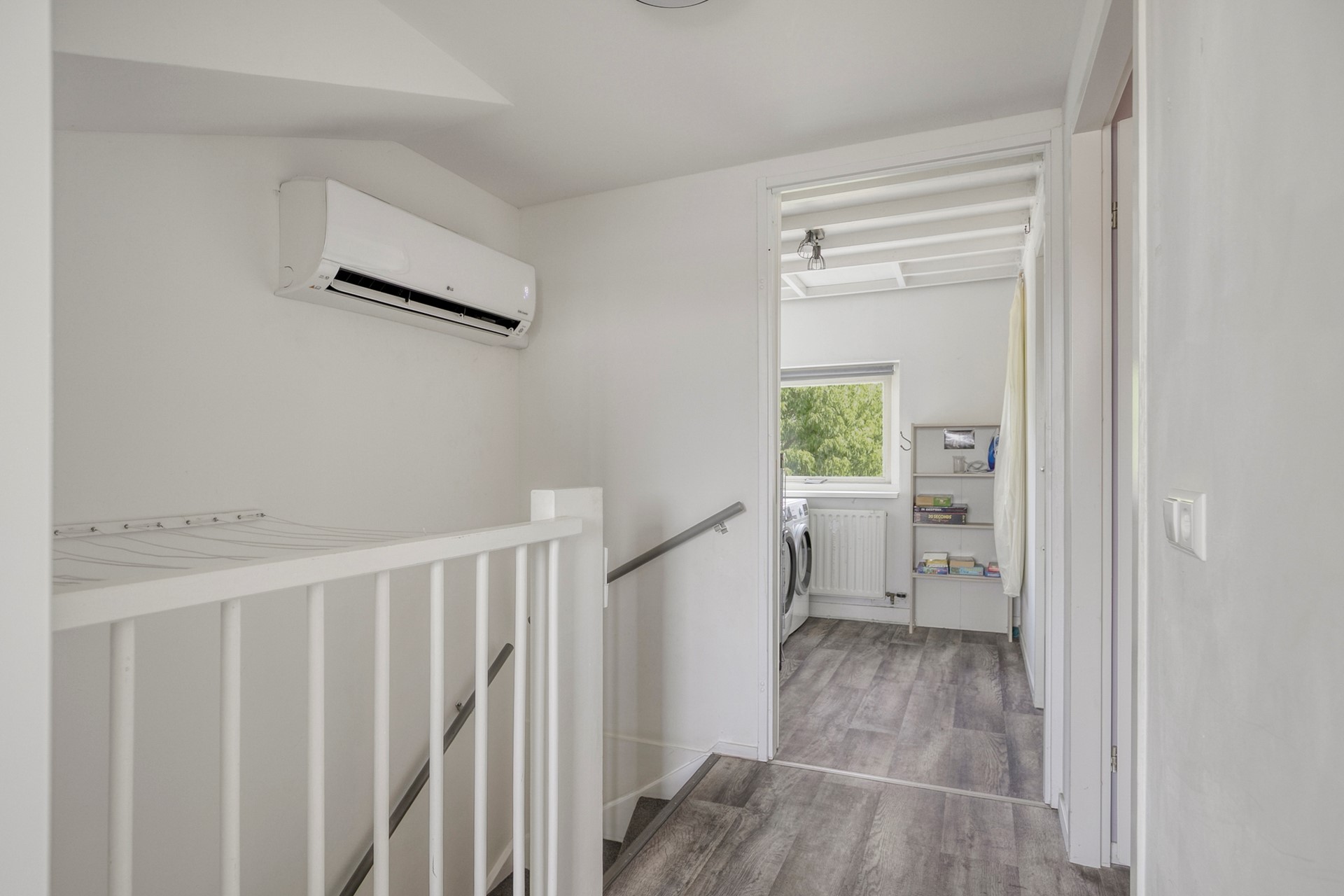 Voorzolder met airconditioning ( LG 5 kw), warmtepompboiler tot 450 liter op 40 graden, hr cv ketel Nefit ( > 20 jaar), wasmachine-en drogeropstelling, toegang tot bergzolder d.m.v. een vlizotrap, toegang tot drie slaapkamers die zijn vergroot door toepassing van een dakkapel die zijn v.v. elektrisch bedienbare rolluiken.
