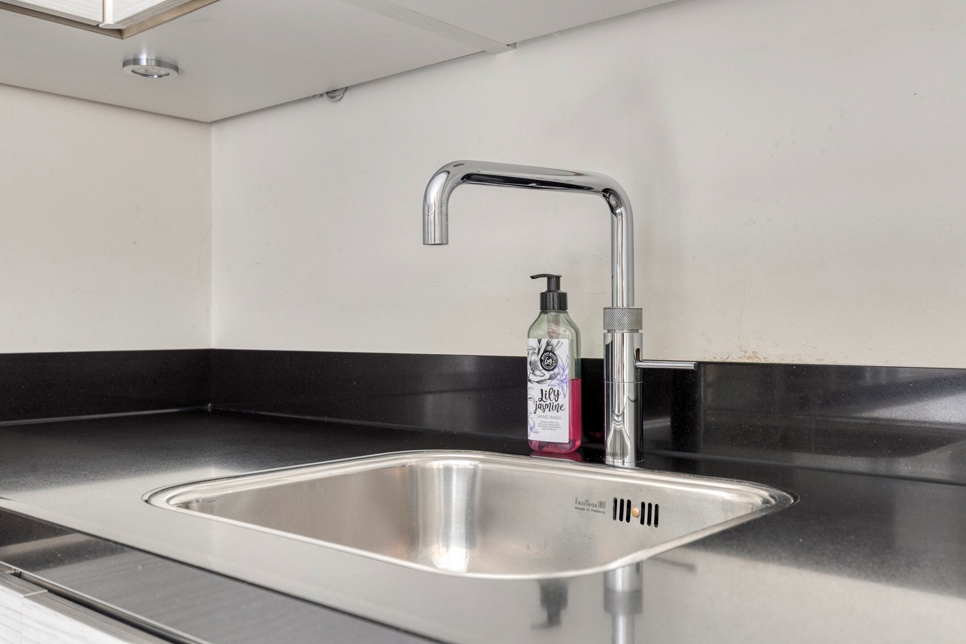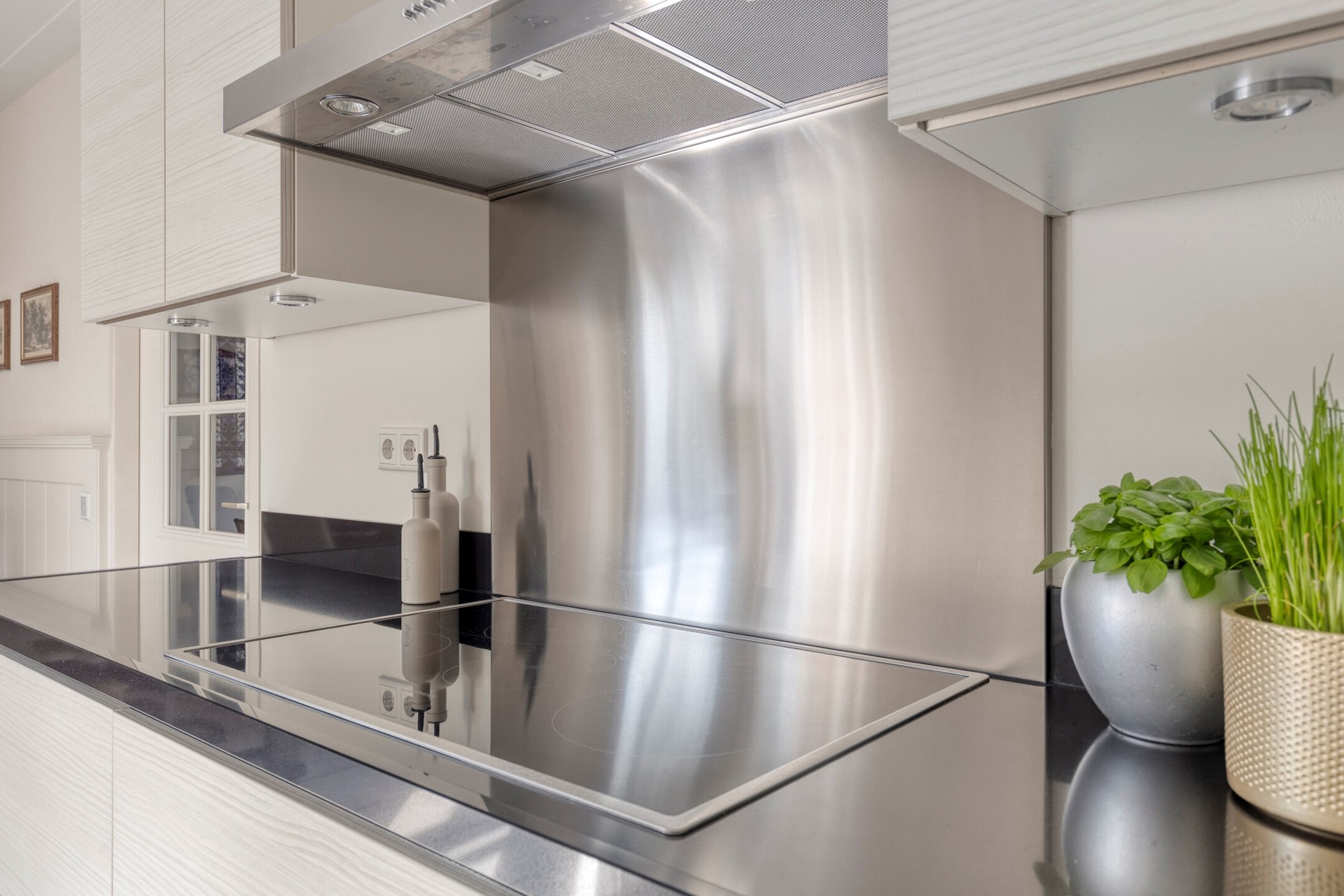 Aan de achterzijde van de woning bevindt zich een gesloten keukenruimte, uitgerust met een moderne keuken (hoekopstelling, 2014) voorzien van diverse inbouwapparatuur, waaronder: