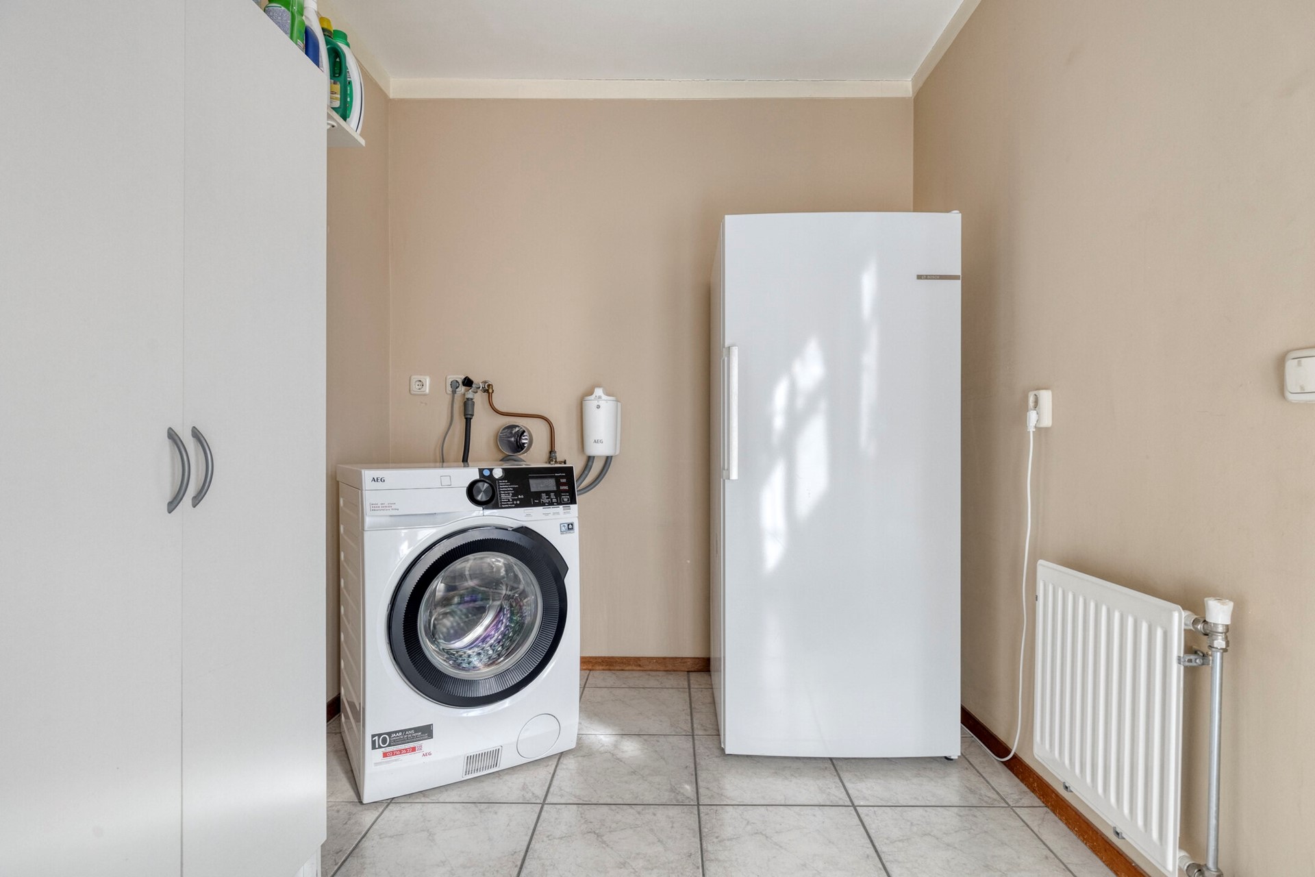 Vanuit de keuken is er toegang tot de bijkeuken, met aansluiting voor de wasmachine-en droger (aparte stroomgroepen), en verder doorloop naar de aangebouwde enkele garage.