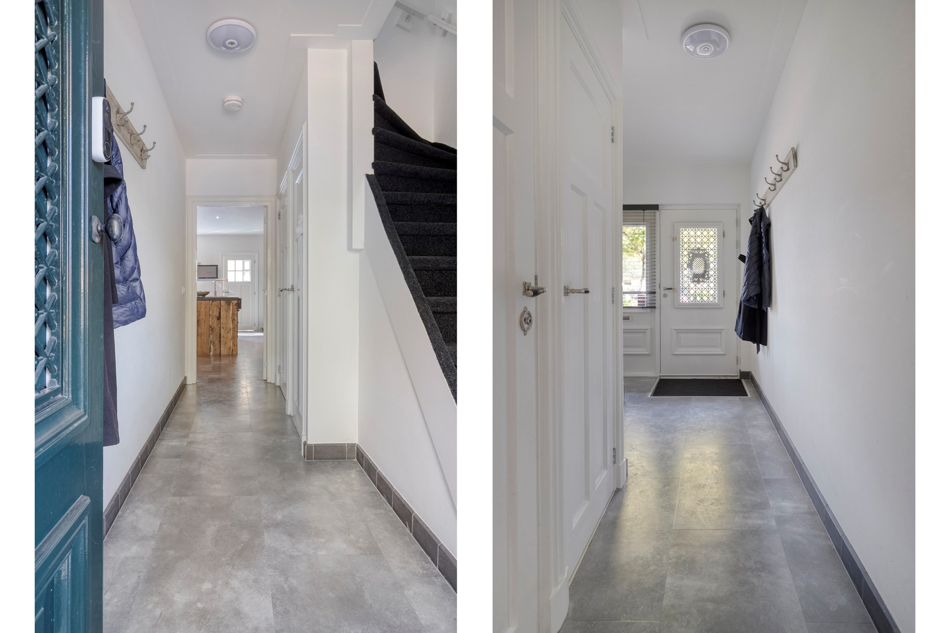 Via de oprit met parkeergelegenheid op eigen terrein bereikt u de entree van de woning. In de hal bevinden zich de toiletruimte, een praktische bergkast met de elektrische installatie (voorzien van moderne automaten en een aparte PV-groep), en toegang tot de leefruimte.