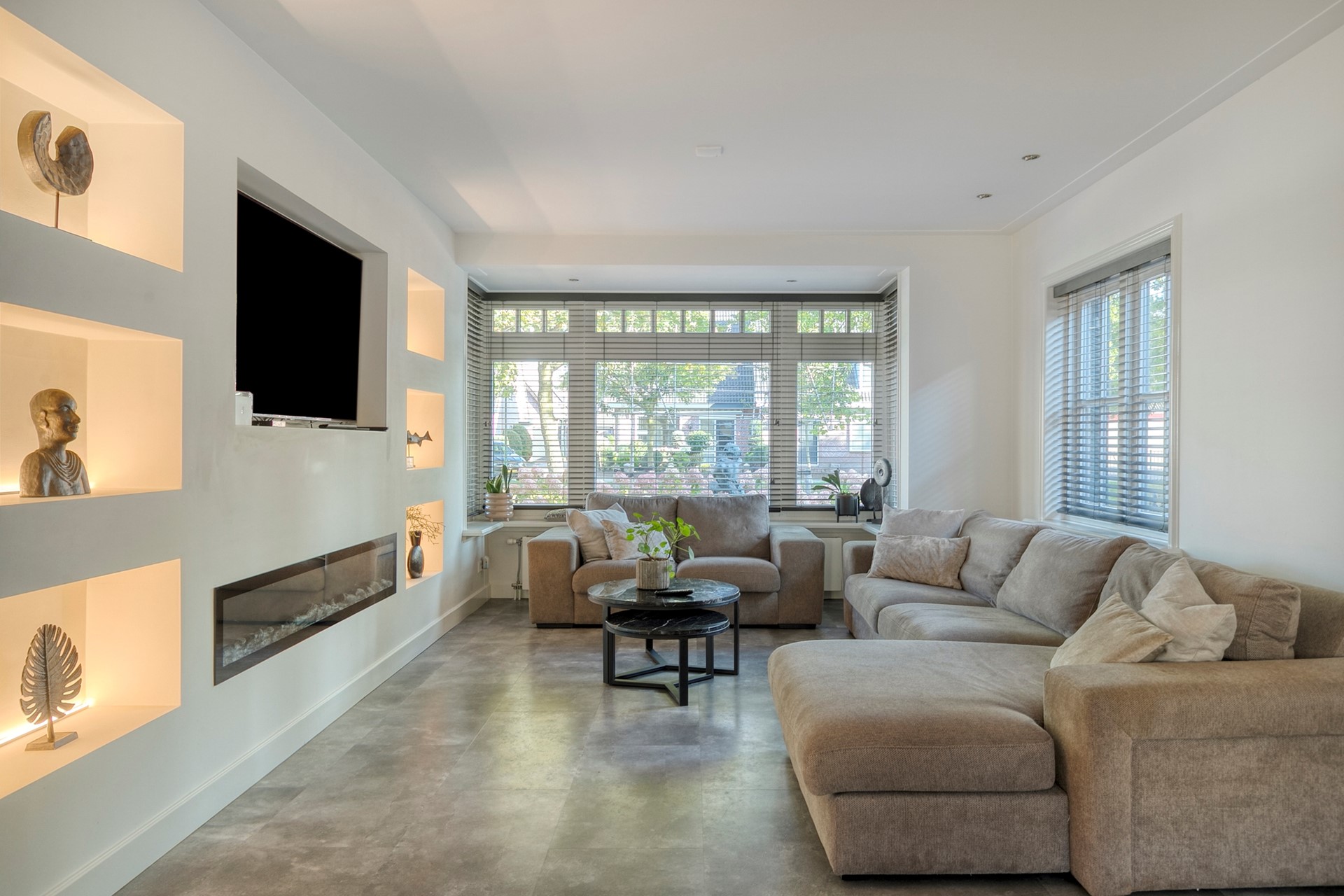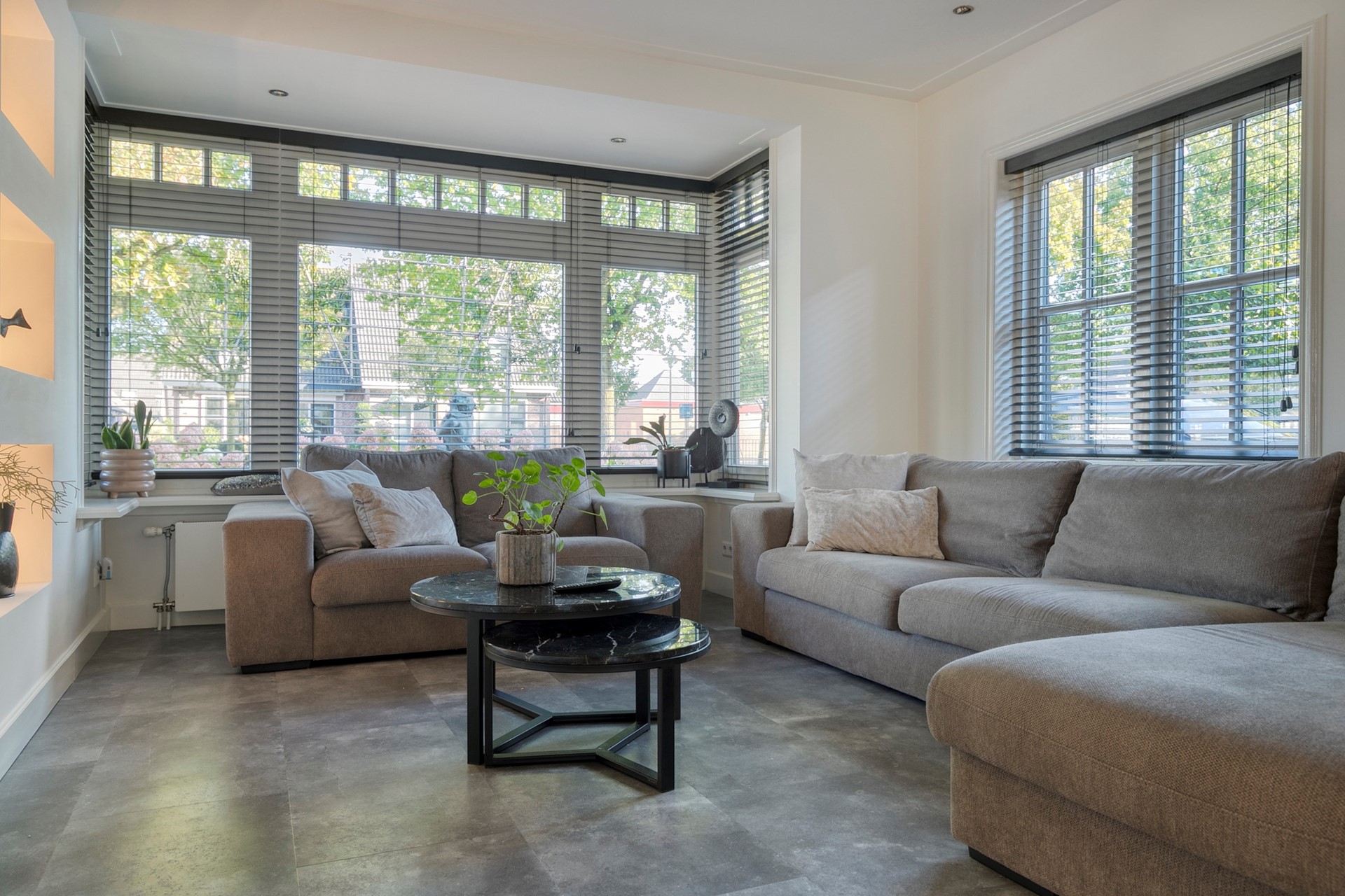De lichte woonkamer is sfeervol en comfortabel, voorzien van een moderne vinyl-look vloertegel met vloerverwarming en een charmante erker aan de voorzijde. Aan de achterzijde is de woning uitgebouwd, wat zorgt voor extra leefruimte en een royale opstelling van de keuken.