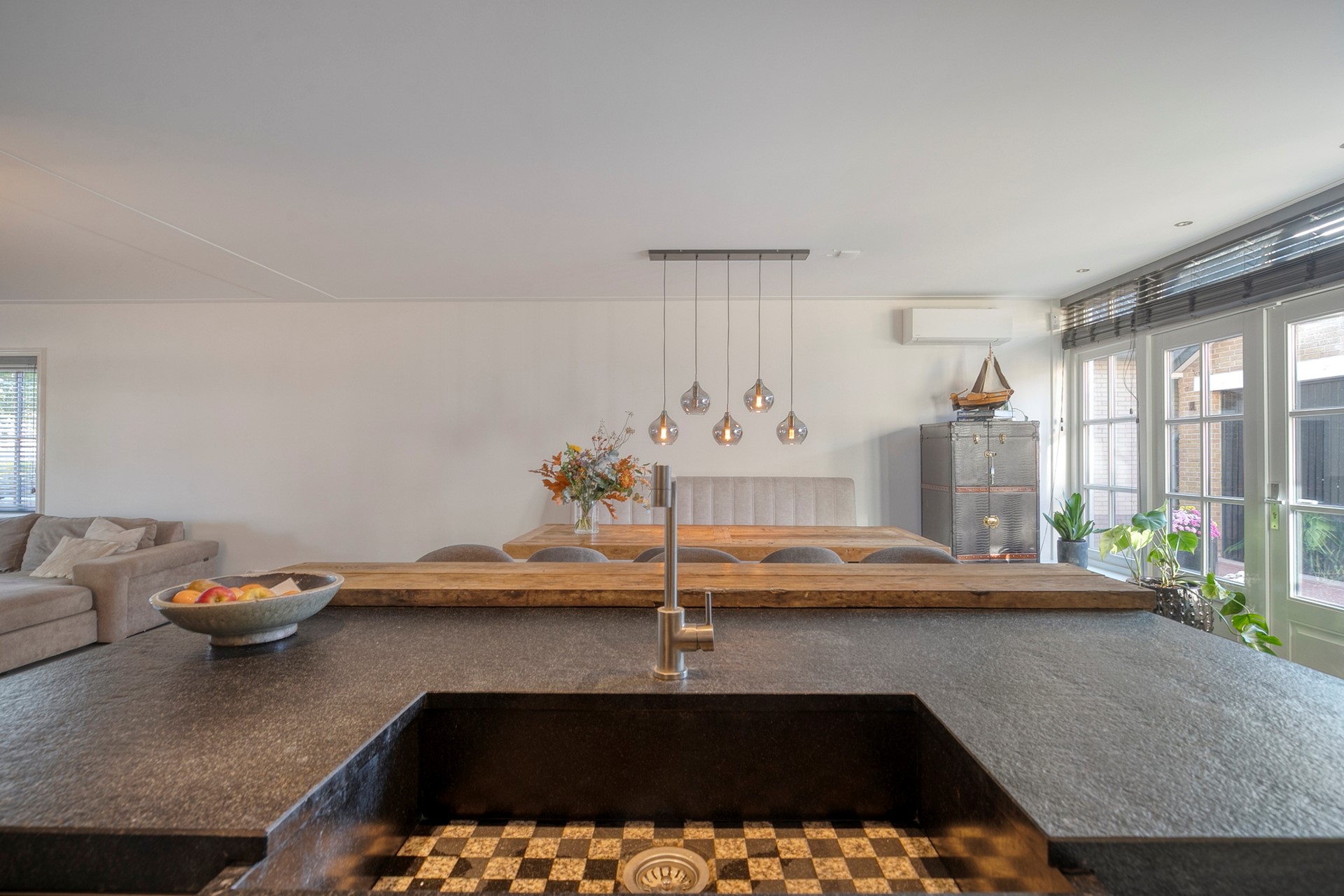 De luxe keuken is compleet uitgerust met een spoeleiland en hoogwaardige inbouwapparatuur, waaronder een 5-pits gaskookplaat met ovens, een design afzuigschouw, een combi-oven/magnetron, vaatwasser, Amerikaanse koelkast en een boiler in de spoelkast. Deze ruimte is eveneens voorzien van airconditioning (2024). Aansluitend bevindt zich een bijkeuken met wasmachineaansluiting – ideaal voor extra bergruimte en gemak.
