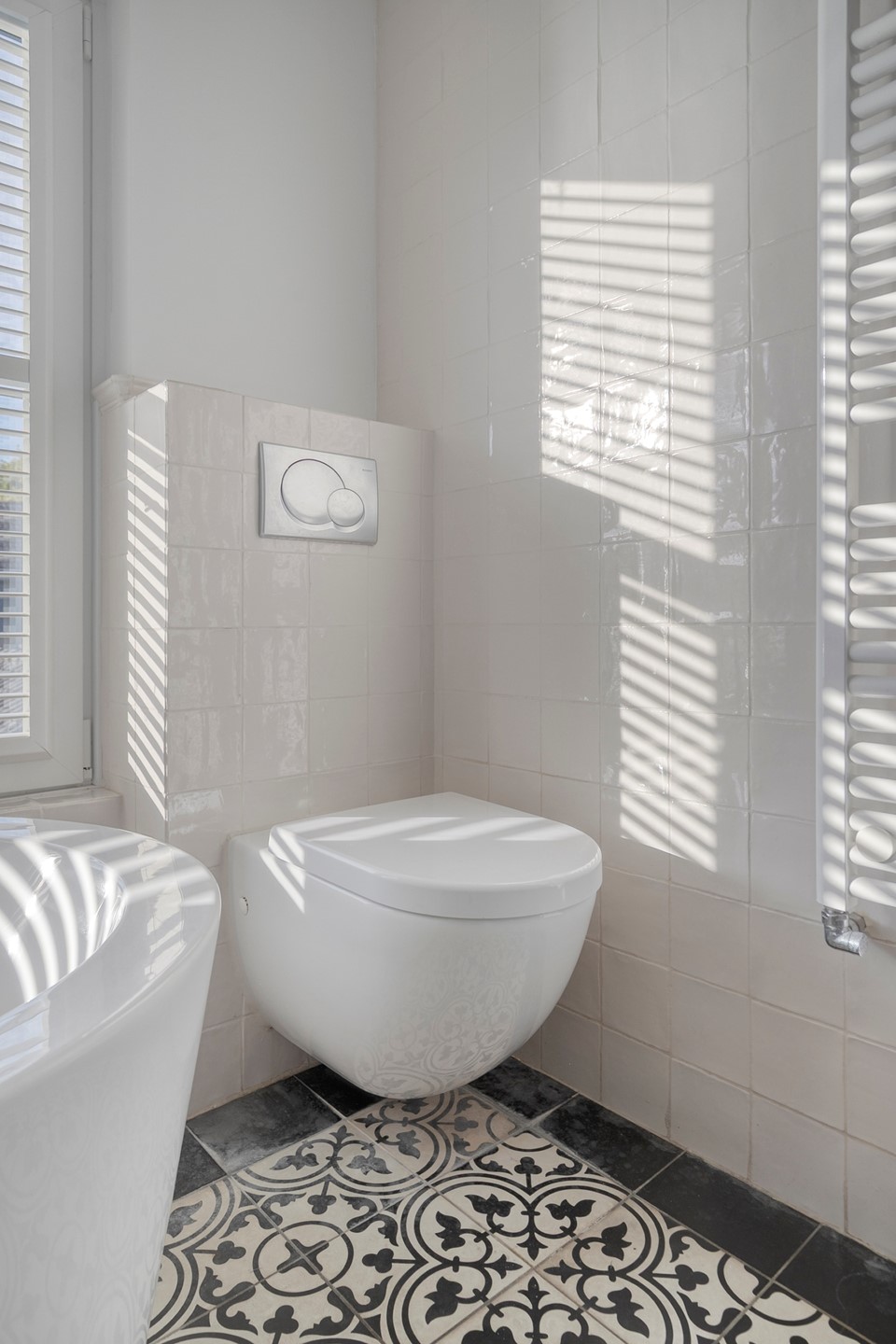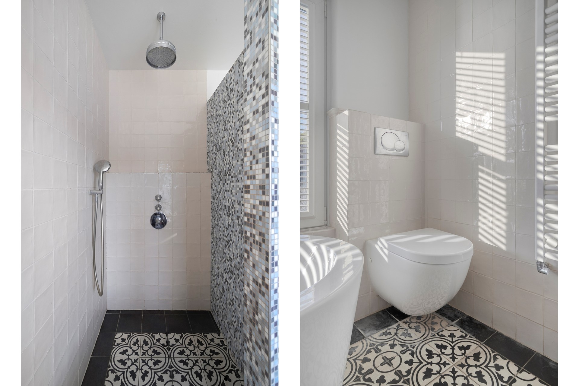 Op de eerste verdieping leidt de overloop naar twee ruime slaapkamers en een luxe badkamer (2012). Deze badkamer is modern en compleet ingericht met een ligbad, dubbele wastafel met meubel, inloopdouche, een tweede (hangend) toilet, en is voorzien van zowel daglicht als natuurlijke en mechanische ventilatie. De cv-gestuurde vloerverwarming zorgt hier voor extra comfort.