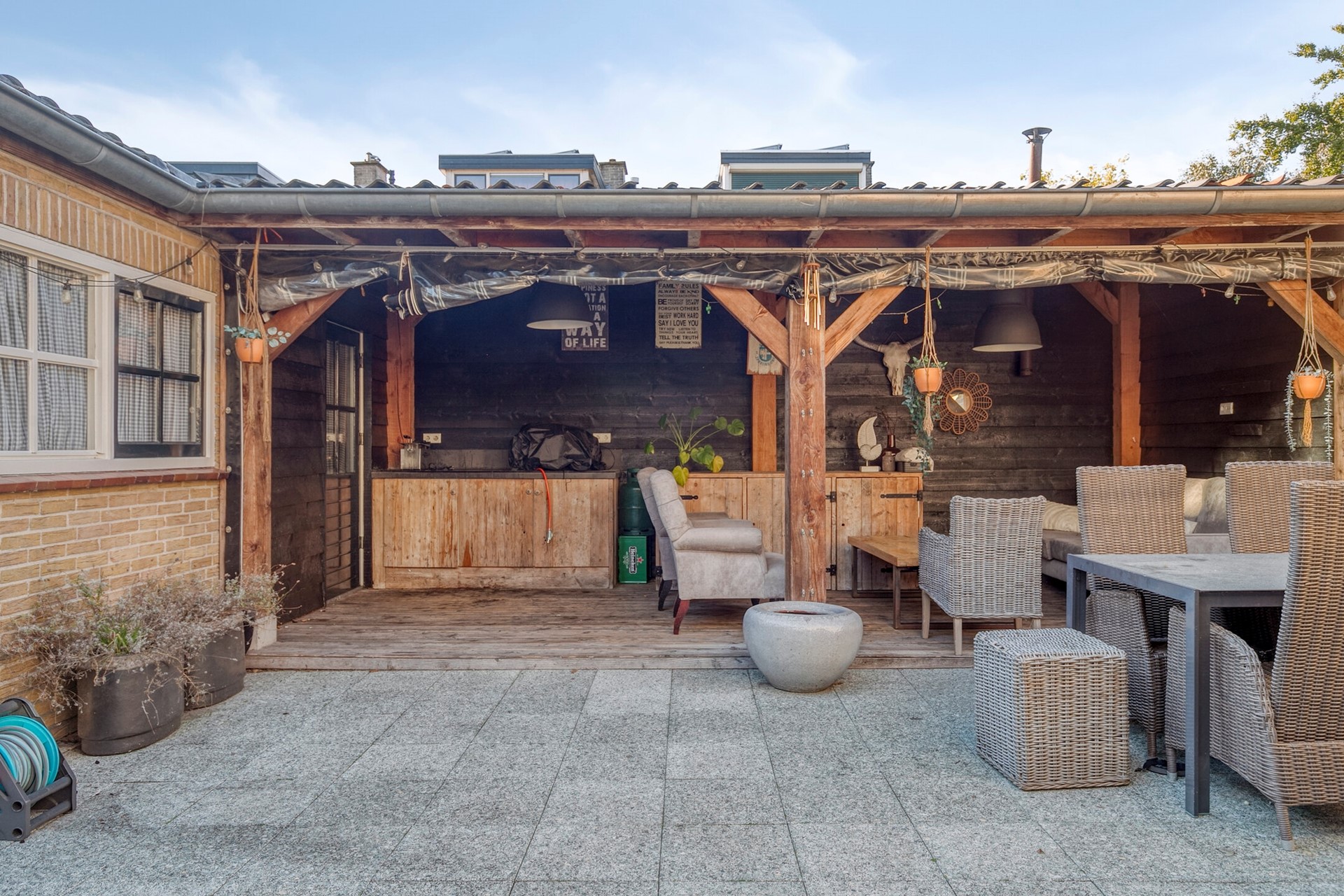 Een absolute eyecatcher is de robuuste houten overkapping die zich uitstrekt over de volledige breedte van de tuin. Deze sfeervolle buitenruimte is ideaal ingericht als tweede woonkamer in de buitenlucht, met een gezellige loungehoek en een praktische buitenkeuken. Dankzij de overdekte opstelling kun je hier het hele jaar door comfortabel vertoeven – of je nu wilt ontspannen met een boek, gezellig wilt borrelen of een barbecue organiseert.