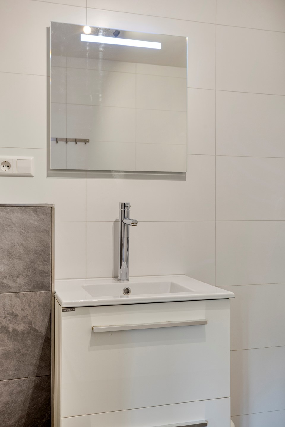 De badkamer op de begane grond is van alle gemakken voorzien: een ruime inloopdouche, een hangend toilet, wastafelmeubel met dubbele lades én ruimte voor zowel je wasmachine als je droger. Ook aan de details is gedacht – denk aan een designradiator en mechanische ventilatie. Die dagelijkse klusjes draaien zo op rolletjes! Je hoeft geen trap op met je wasgoed, hoe fijn is dat?