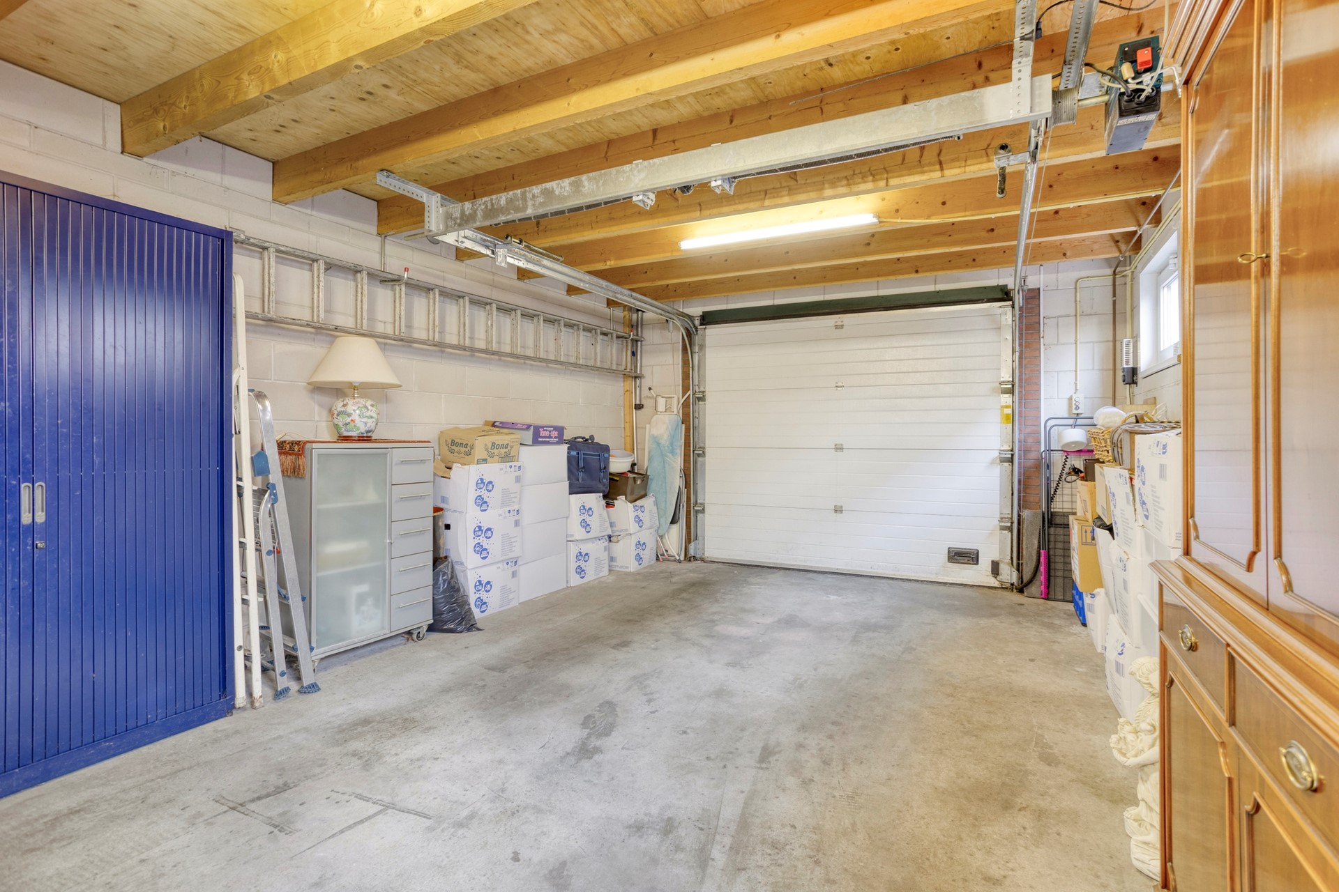 De garage biedt ruimte voor stalling van een auto, de bergzolder is op stahoogte.