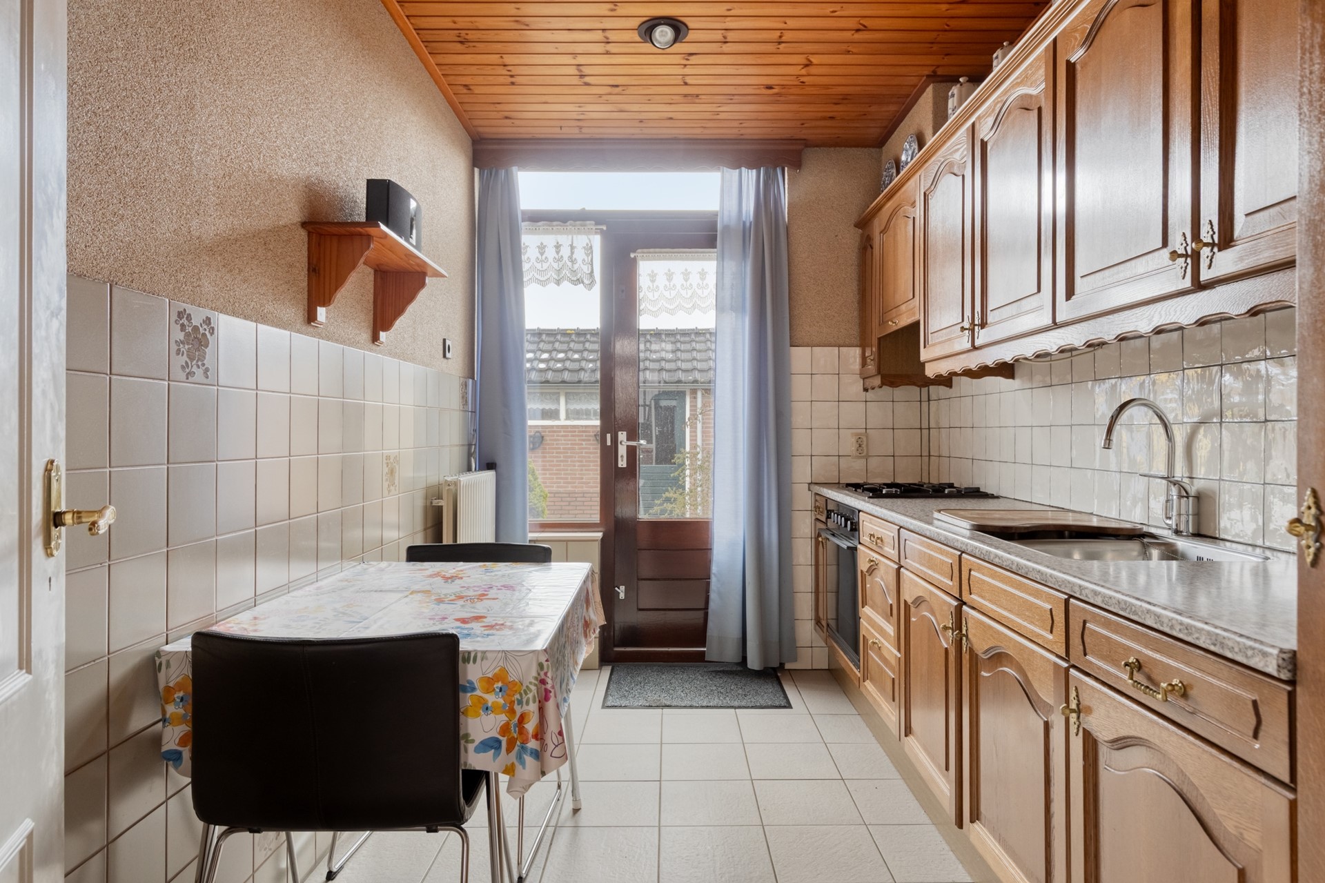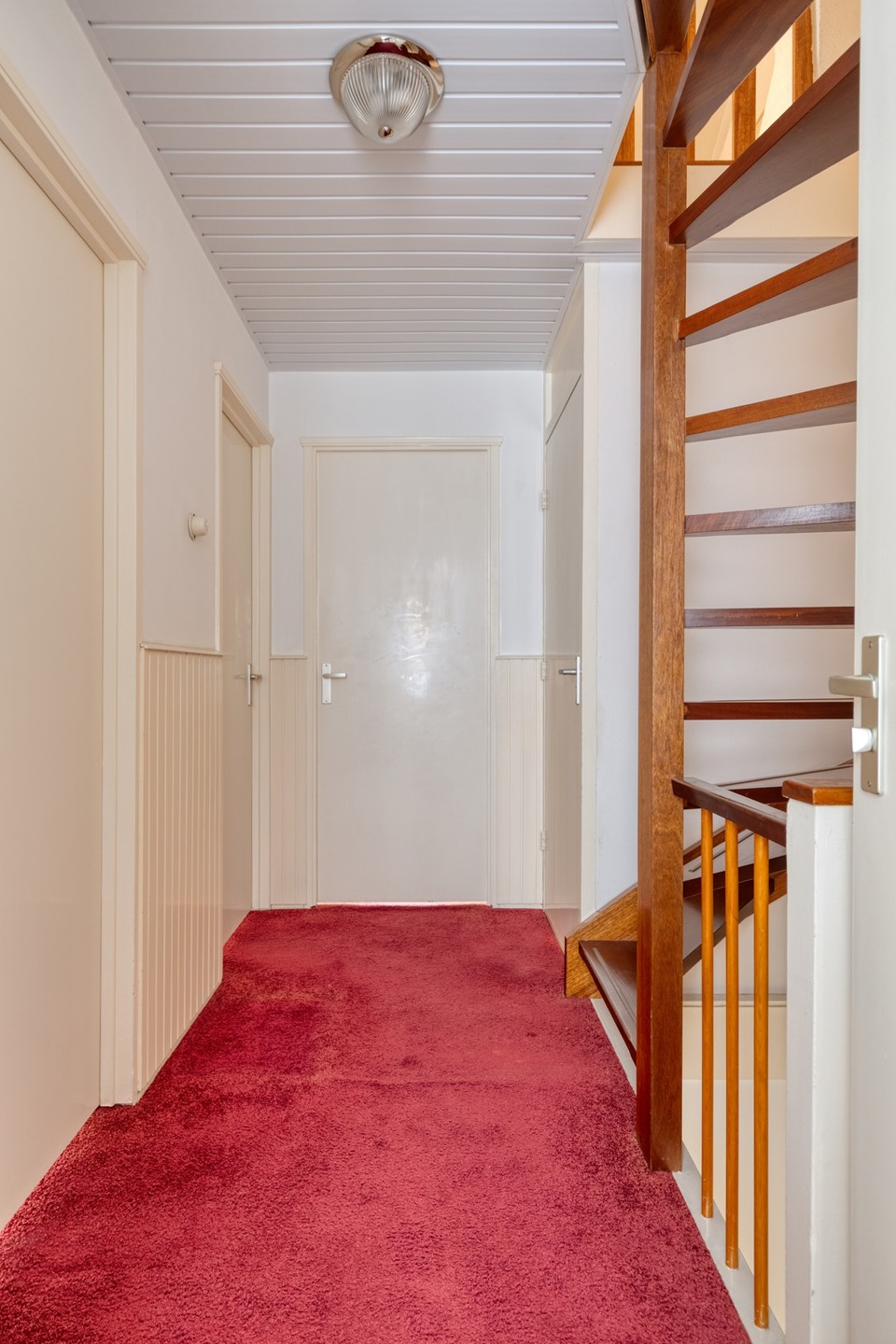 Entree aan de voorzijde, hal met toiletruimte, meterkast, trap bergkast, vaste trap naar de 1e verdieping, toegang tot de doorzonkamer en de dichte keukenruimte. De keukenruimte is naast de woonkamer gesitueerd en beschikt over een wandkeuken met gaskookplaat, oven en koelkast.