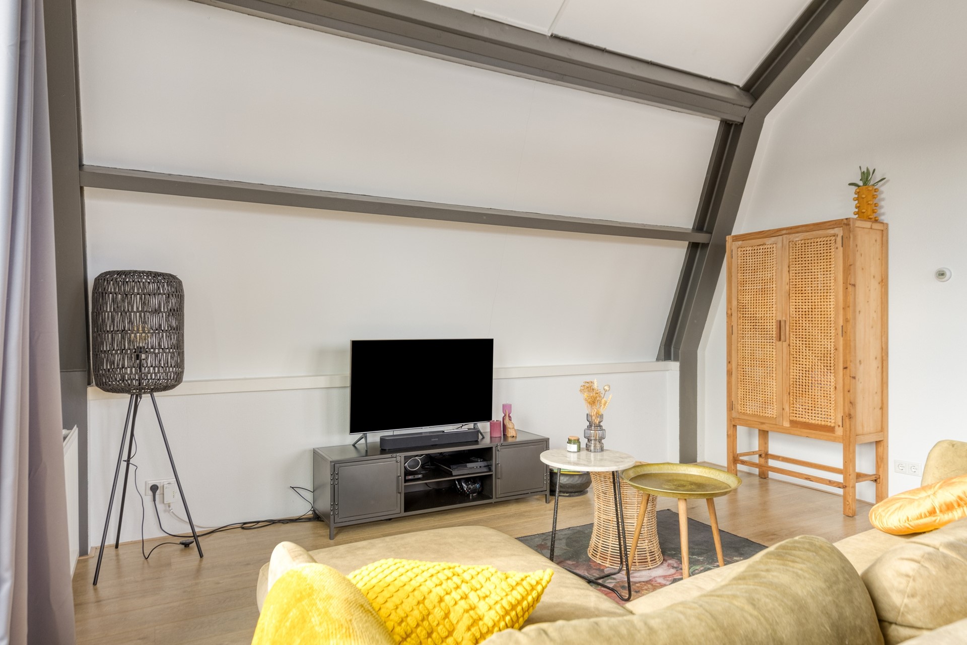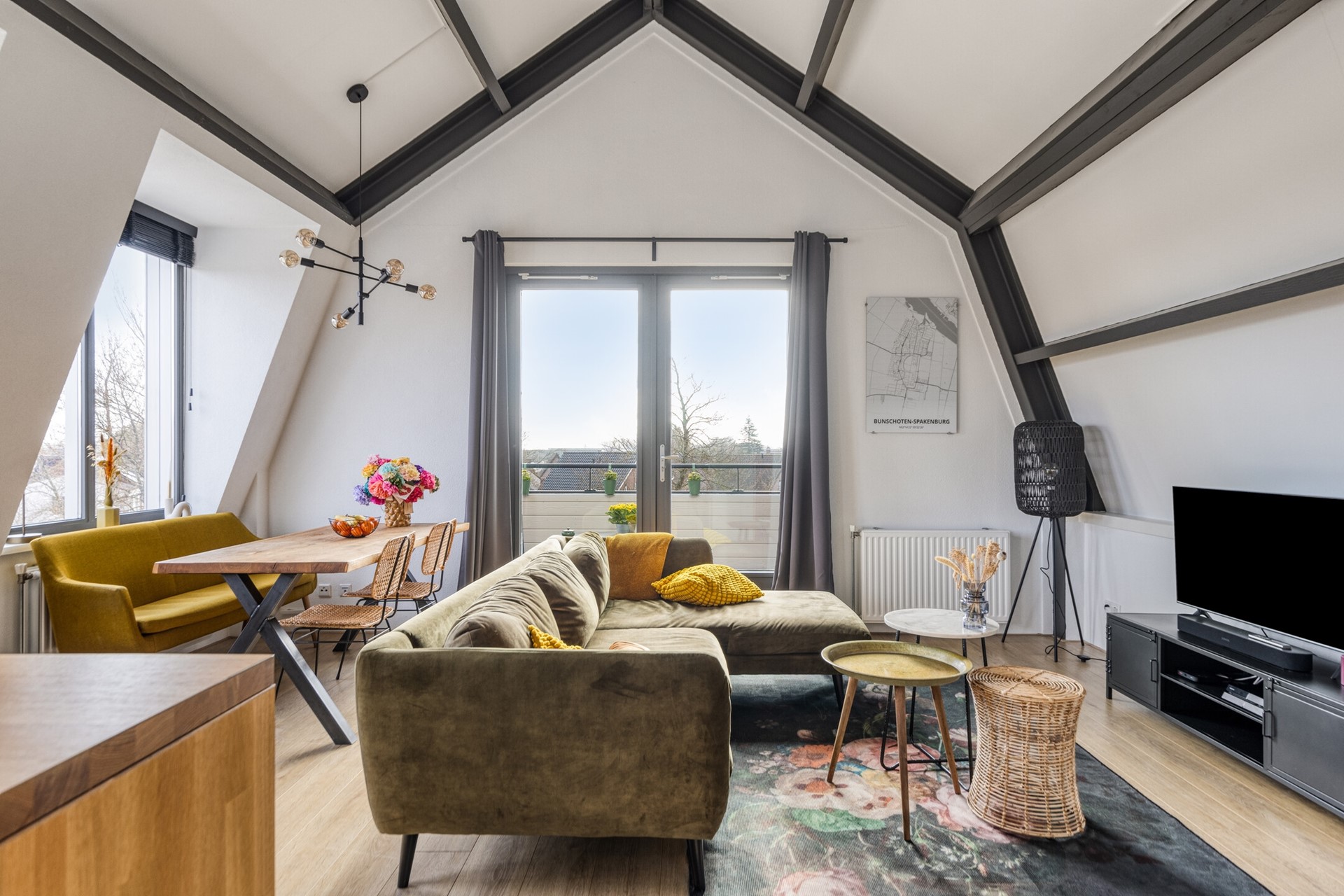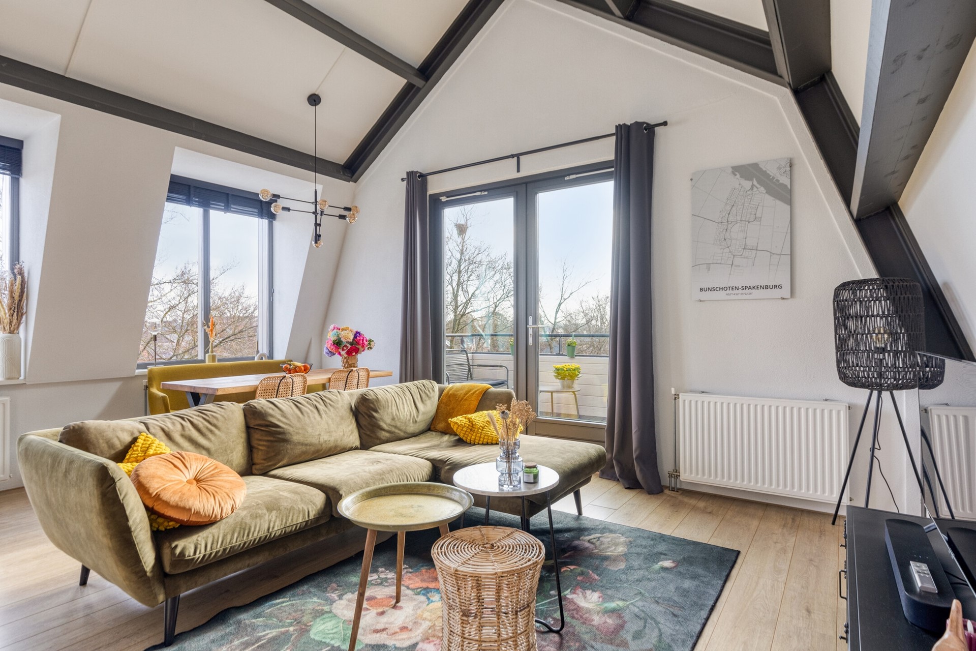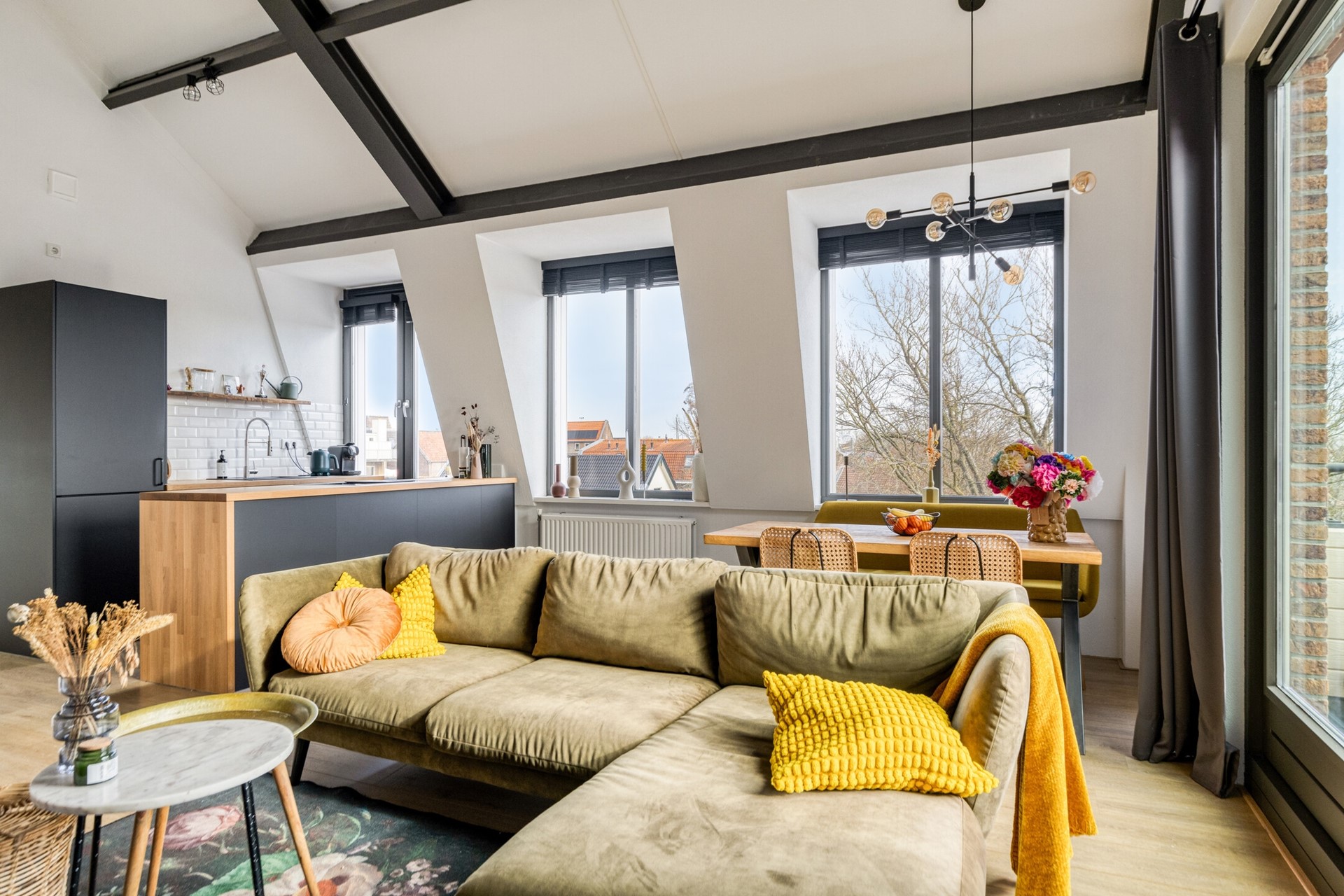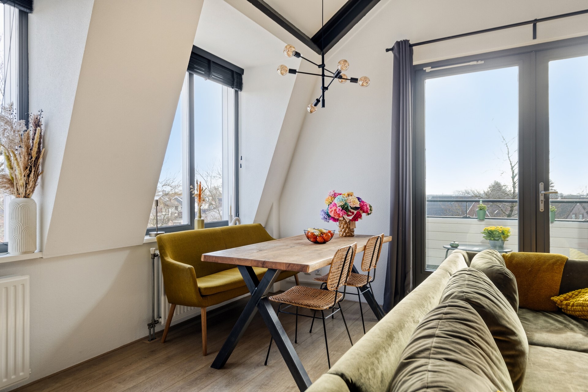 Woonkamer met hoge plafonds en veel lichtinval
