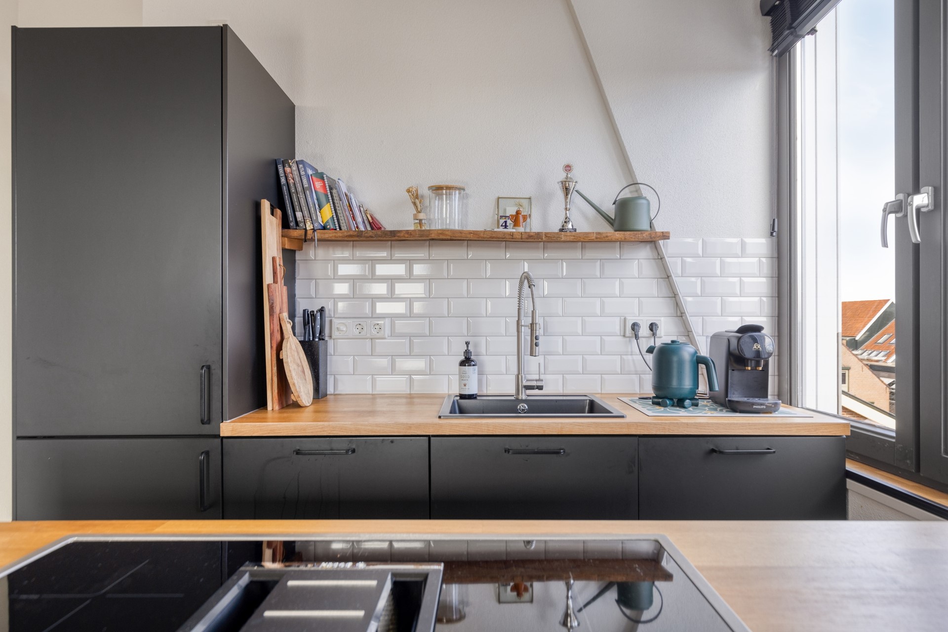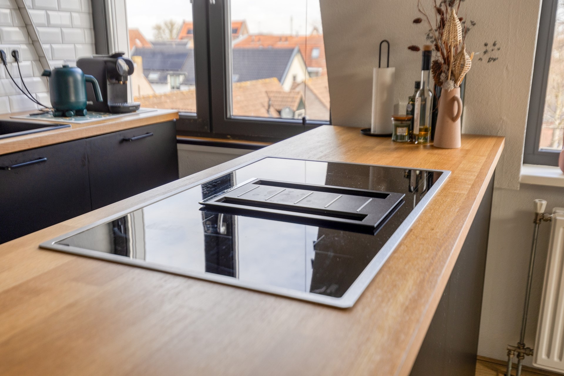 Open keuken met moderne inbouwapparatuur (inductiekookplaat, combi-oven, koelvriescombi